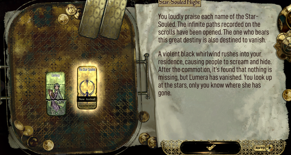 There are two major routes for Lumera’s character arc: one is ascending to be the star-souled, and the other is to avenge. To help with the confrontation against the magician, players need to go for the arc of the star-souled ascension. After this, Lumera becomes a passive assistant card. She will descend later in the ending to counter the magician.